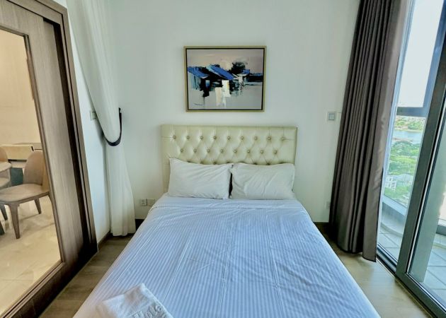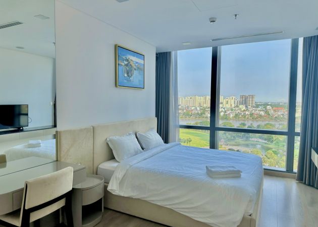 Hai phòng ngủ được thiết kế ấm cúng với giường lớn, tủ quần áo âm tường và bàn trang điểm. Phòng ngủ chính có cửa sổ lớn, mang lại cảm giác thoáng đãng và thư giãn.